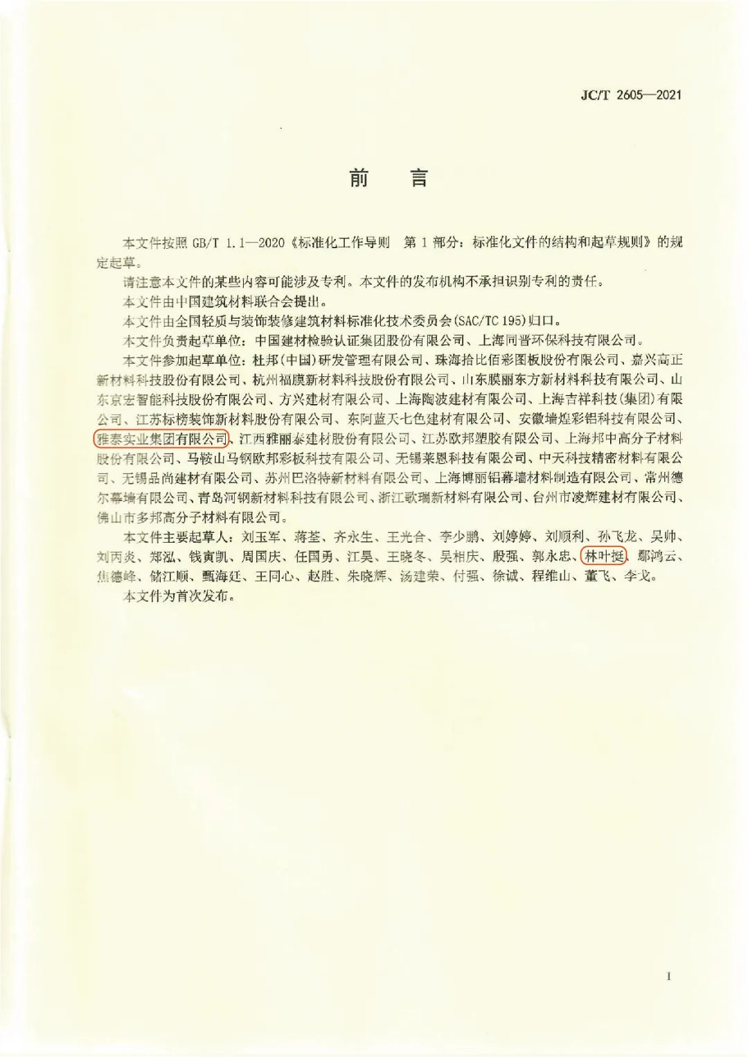 近日,由中國建筑材料聯(lián)合會提出,雅泰實(shí)業(yè)集團(tuán)參與起草的《JC/T2605-2021建筑裝飾用氟碳覆膜金屬板》、《JC/T2607-2021建筑屋面用預(yù)輥涂金屬板》兩項(xiàng)行業(yè)標(biāo)準(zhǔn)于2021年3月5日發(fā)布,同年7月1日正式實(shí)施,公司技術(shù)部經(jīng)理林葉挺為此次兩項(xiàng)行業(yè)標(biāo)準(zhǔn)的主要起草人之一。